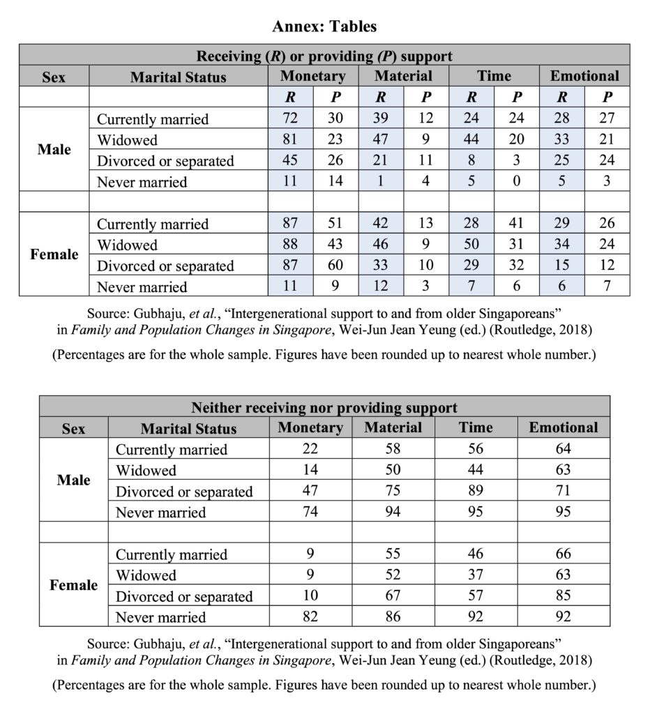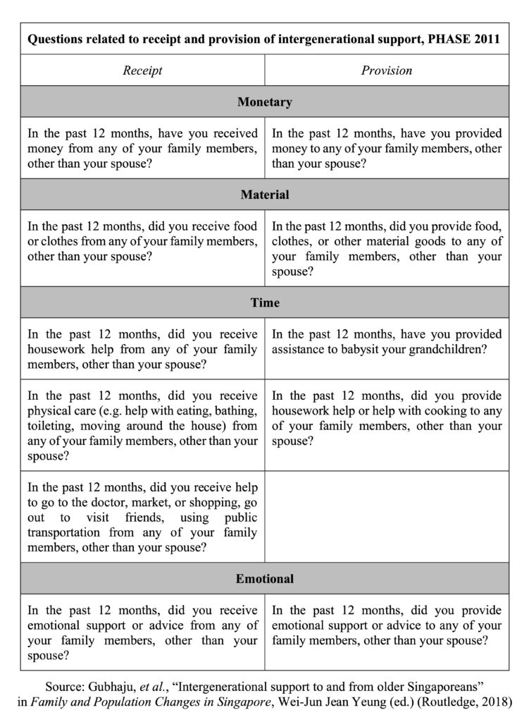 Drawing from the 2011 Panel on Health and Ageing of Singaporean Elderly (PHASE), a comprehensive source of data on intergenerational support, the researchers analysed the types of support received and provided based on different characteristics of older Singaporeans. The study defined the “elderly” as those aged 62 years and above.