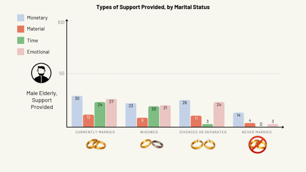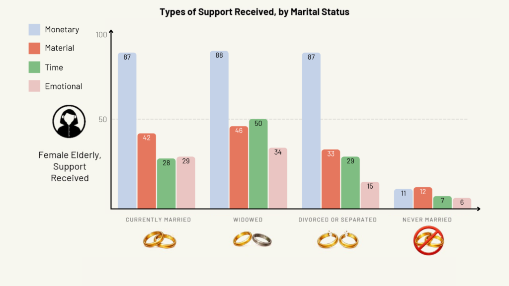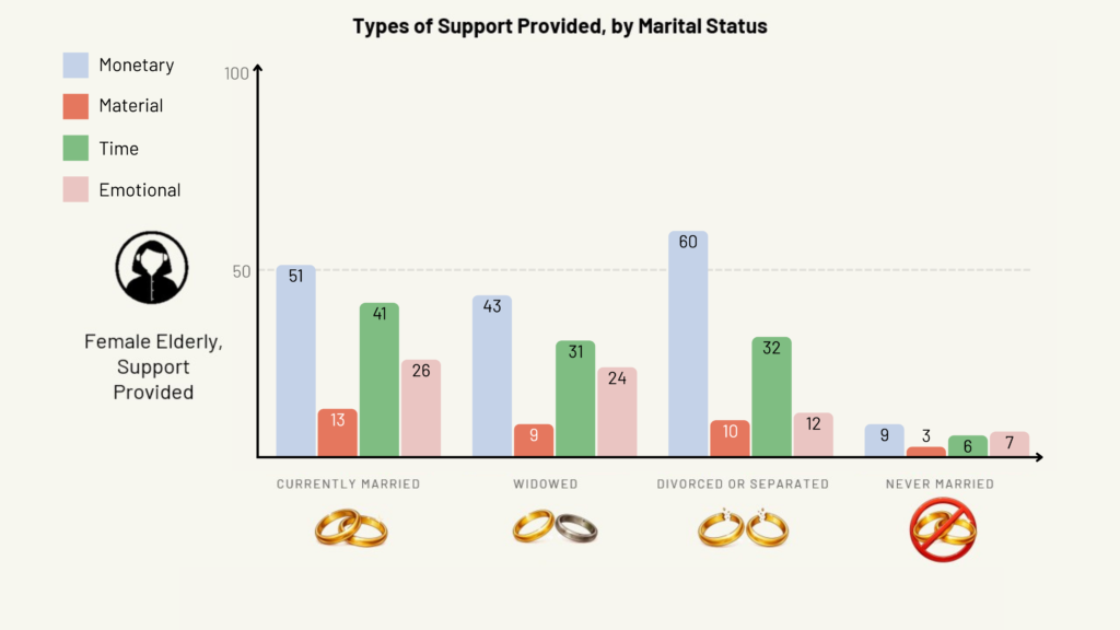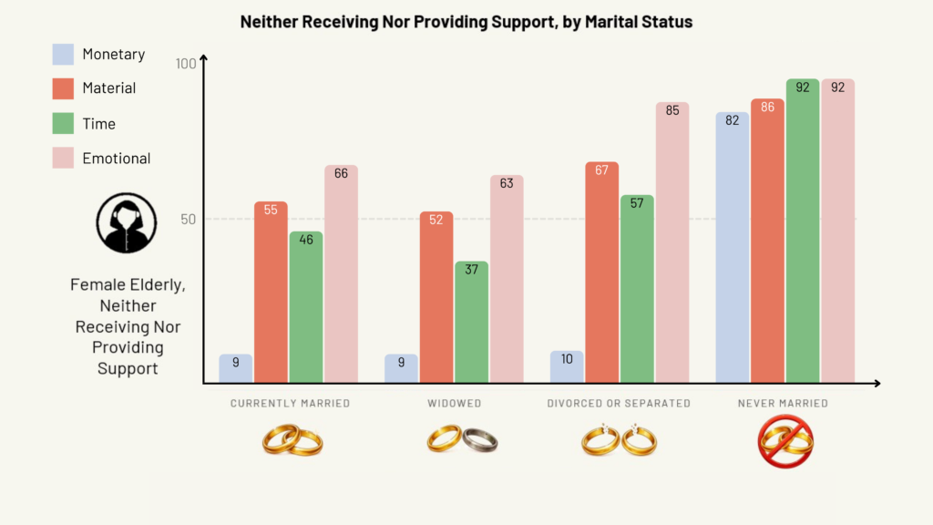 On the other hand, divorced or separated elderly women still received and provided fairly high levels of monetary and time support, somewhat comparable to their married peers.