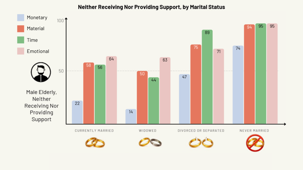 Never-married elderly were the most likely to neither receive nor provide family support of various kinds, with men more likely than women to neither receive nor provide support. This was followed by divorced or separated men.