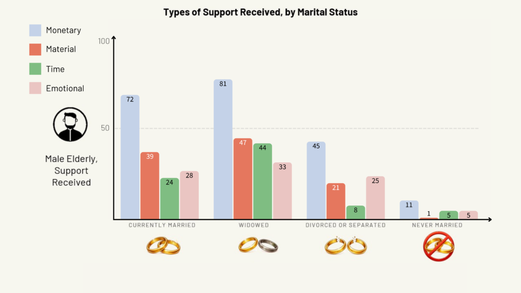 However, there are big differences in terms of all kinds support received or provided depending on marital status, especially for men. Never-married elderly received and provided the least amounts of all kinds of support, followed by elderly men who were divorced or separated.